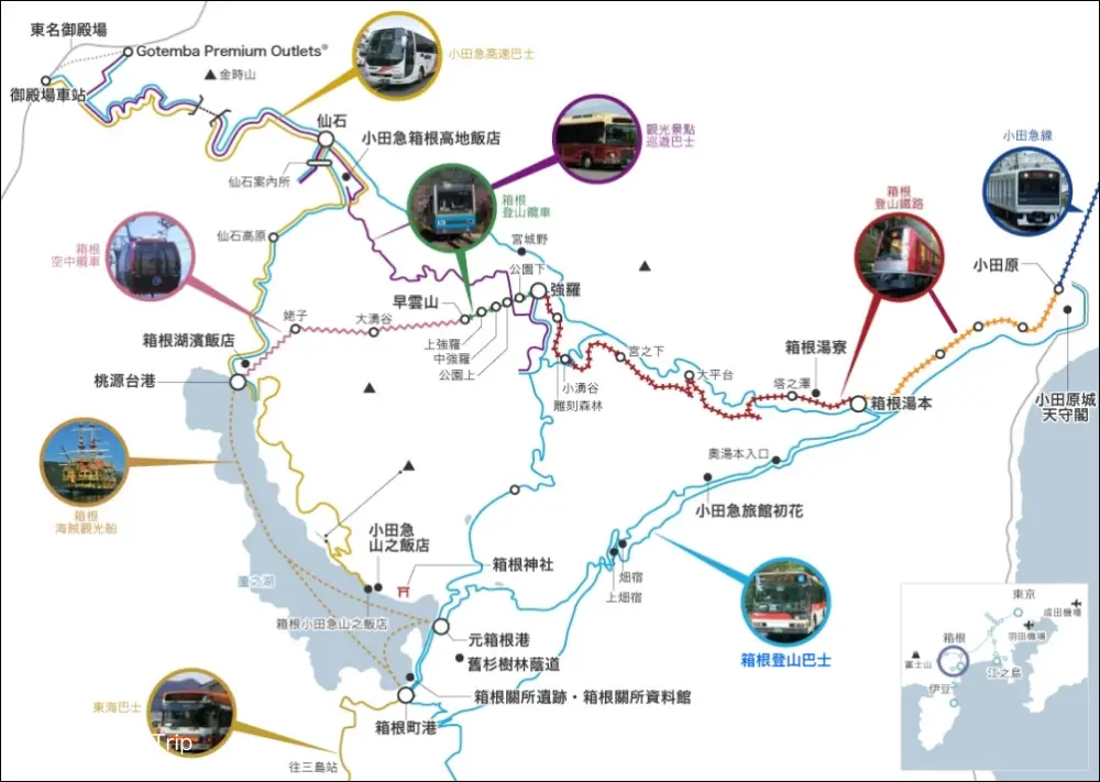 這張地圖也清楚標示各種交通方式,包含登山鐵道、纜車、巴士與遊船。使用箱根周遊券(Hakone Free Pass)可以一次涵蓋地圖上箱根所有的交通工具,讓你不必煩惱單程票務,非常適合規劃一日或二日的箱根自助旅遊。