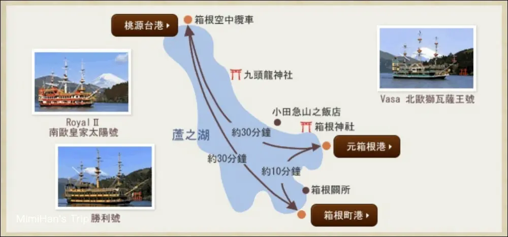 - 交通:從箱根湯本站搭巴士至元箱根港,步行即可登船