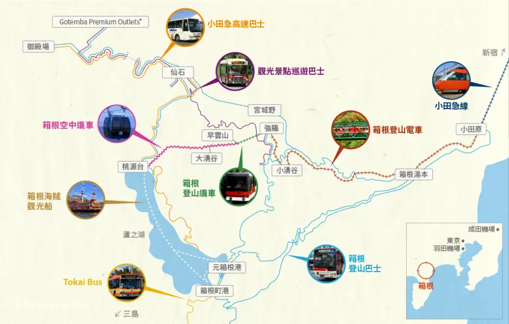 規劃箱根自由行時,先看個地圖能讓整個行程更清楚,箱根的觀光路線幾乎呈現一個環狀,從箱根湯本站出發,搭登山鐵道一路往強羅,再轉乘空中纜車到大湧谷,之後銜接蘆之湖海賊觀光船,最後再回到元箱根或桃源台港。整體串連成一個「黃金環狀路線」,不僅涵蓋箱根經典景點,也能節省交通轉乘時間。