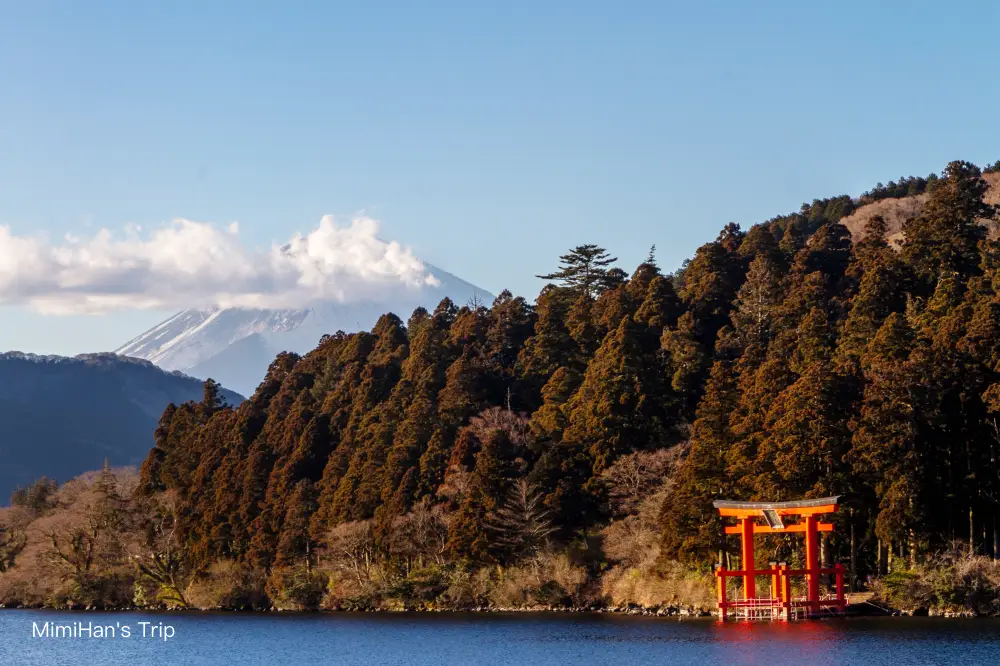 最具代表性的就是湖畔的「平和之鳥居」。紅色鳥居矗立在湖中,與藍天白雲、湖水與遠方山景交織,成為箱根自由行最熱門的打卡景點。清晨或傍晚光線較柔和,遊客較少,適合拍出氣氛感十足的照片。