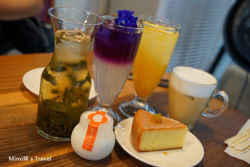 飲料則分別點了霧社廬山高山冷泡茶、蝶豆花檸檬、柳橙汁、榛果拿鐵。