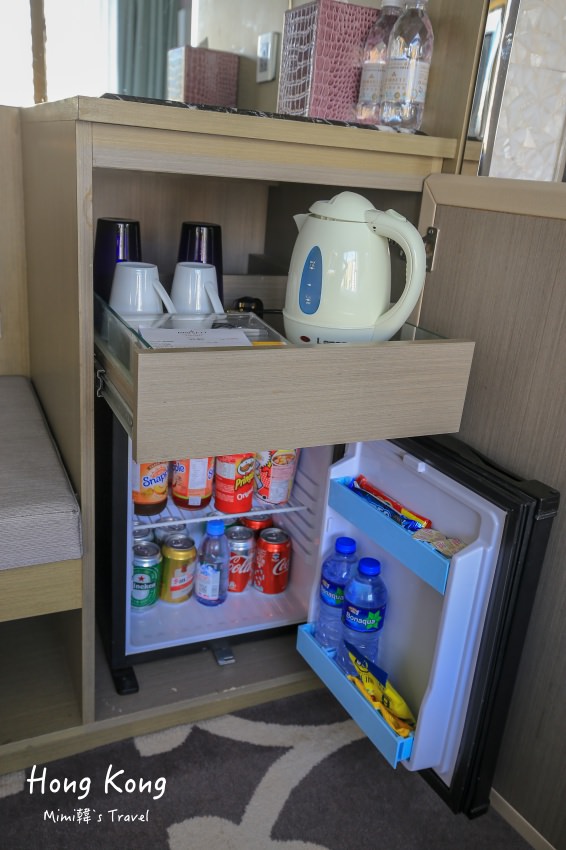 Mini bar 有提供免費的咖啡茶包、礦泉水等,而冰箱裡的飲料零食和架上的酒則是另外付費。(桌上的礦泉水免費,冰箱裡的礦泉水要錢喲 😆 )