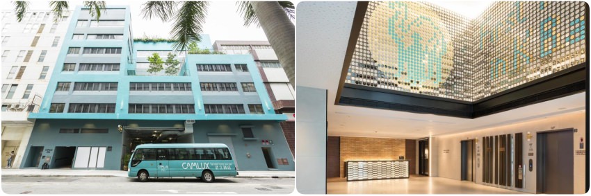 ▲Camlux 是工廠大廈改建,之前做camel䁔水壺,不少裝飾利用暖水壼配對件,如櫃枱,燈飾等,佈置簡潔,空間大,設計感十足,大堂水泥牆富工業風格!房間寬敞,窗外有露天花園景。浴室提供基本需要用品,全是自家品牌用品。住宿期間可搭免費穿梭巴士往返港鐵九龍灣站,可是要注意的是,穿梭巴士不能帶大件行李,只有登機箱不佔位的大小可以帶上車。從九龍灣站走過去不遠,但拖著行李還是累。