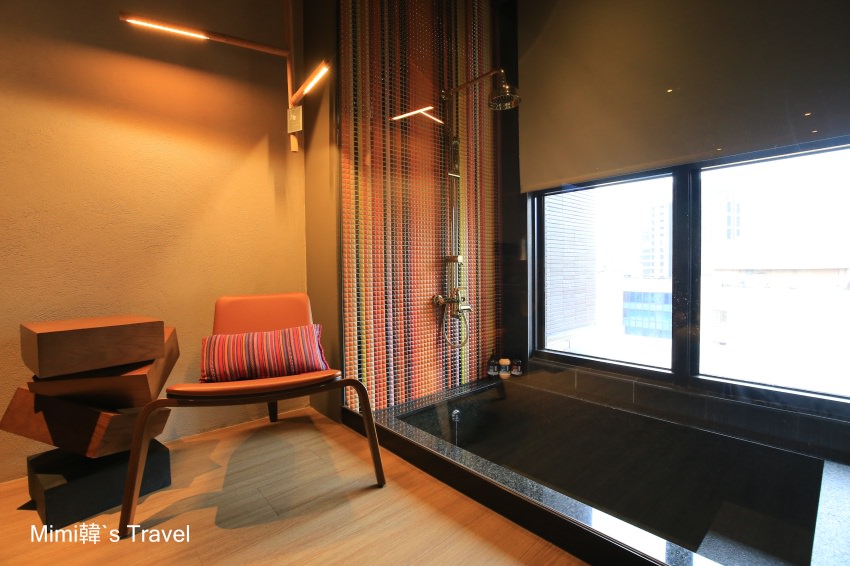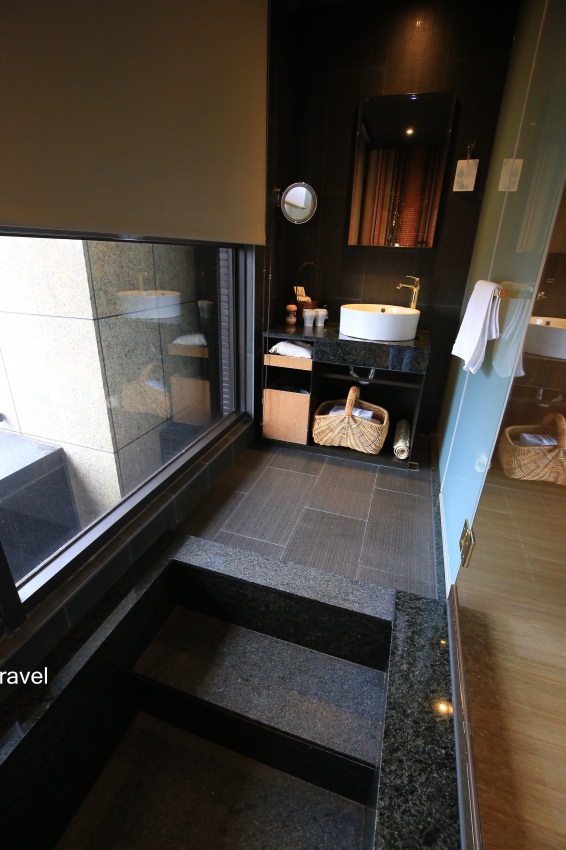 而浴室採用溫泉旅店才比較常見的內嵌式浴缸,放滿水就像在泡溫泉一樣,對內對外的窗簾都是可以拉上的,不用擔心。