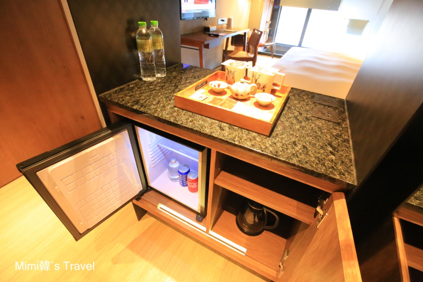 從房門進來首先就會看到Mini bar,桌檯上的咖啡茶包等備品,還有冰箱裡的飲料氣泡水等都是大方的免費使用,這點也可以鵝樂一下。