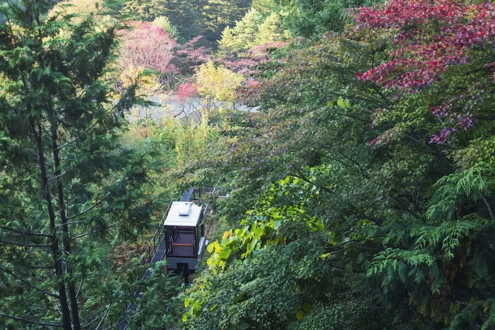 這間飯店最狂的設計,就是「與世隔絕」。當你抵達山腳下的接待處,還沒真正進飯店,你必須搭乘一台專屬「斜坡纜車」,穿過一段森林隧道,緩緩爬升到山頂,飯店的大門才會出現在眼前。這種儀式感極強的入場方式,就像是把世俗的煩惱都留在山下一樣。而且這裡主打「益子燒」陶藝美學,從房間的洗手台到晚餐的器皿,全部都是溫潤的陶器,質感好到讓你很想偷偷買回家。