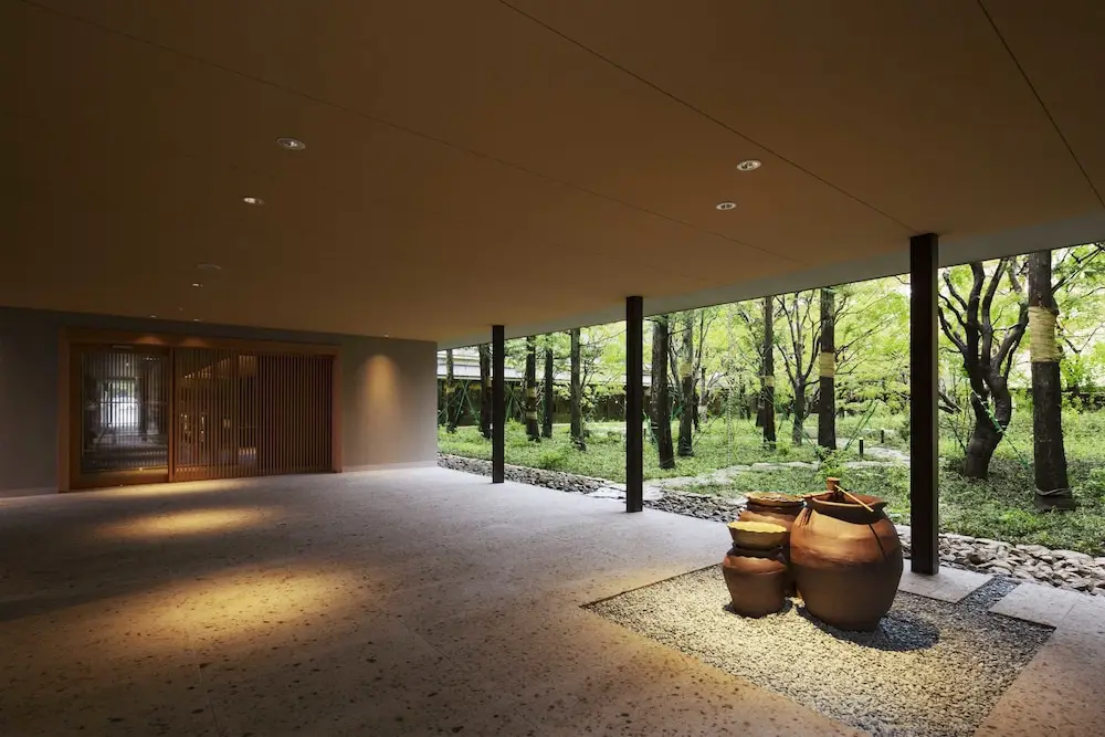 搭界鬼怒川飯店專屬纜車上來後,迎接你的是一個被迴廊包圍的中庭森林。 春天的櫻花、秋天的紅葉,四季景色都在這個中庭裡流轉。大廳鋪滿了益子燒的地磚,走在上面有一種樸實的厚重感。