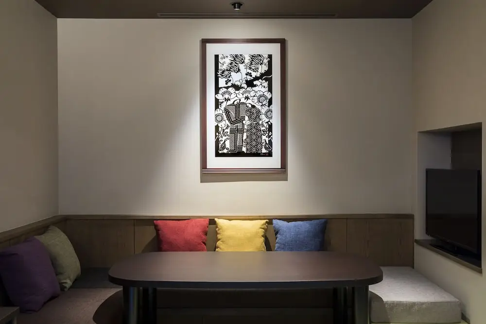 房間設計靈感來自當地的「土藏(倉庫)」,牆上裝飾著長野著名的「剪紙藝術」,搭配由松崎和紙製作的行燈。當夜晚來臨,那個透出來的微黃燈光,會讓整個房間充滿一種「回家了」的安心感。地板鋪設的是赤腳踩也很舒服的木地板和榻榻米,非常適合在地上打滾。