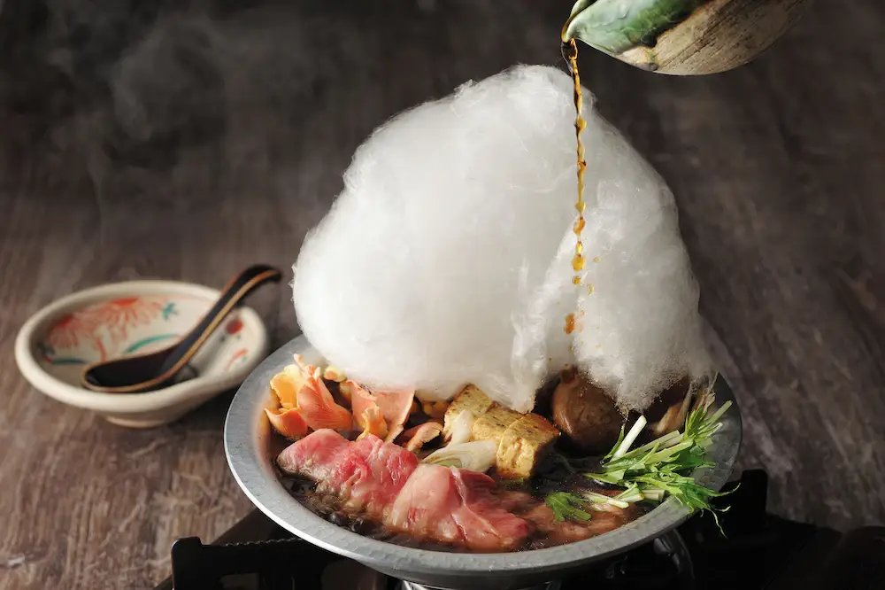 一泊二食的晚餐,其中界阿爾卑斯有一道很特別的「雪鍋 (Yuki-nabe)」。 端上來時,你會看到鍋子上蓋著一大坨白色的棉花糖,象徵北阿爾卑斯山的積雪。淋上壽喜燒醬汁後,棉花糖像雪融一樣化開,變成湯底的甜味來源。視覺效果滿分,而且搭配信州和牛真的很好吃。