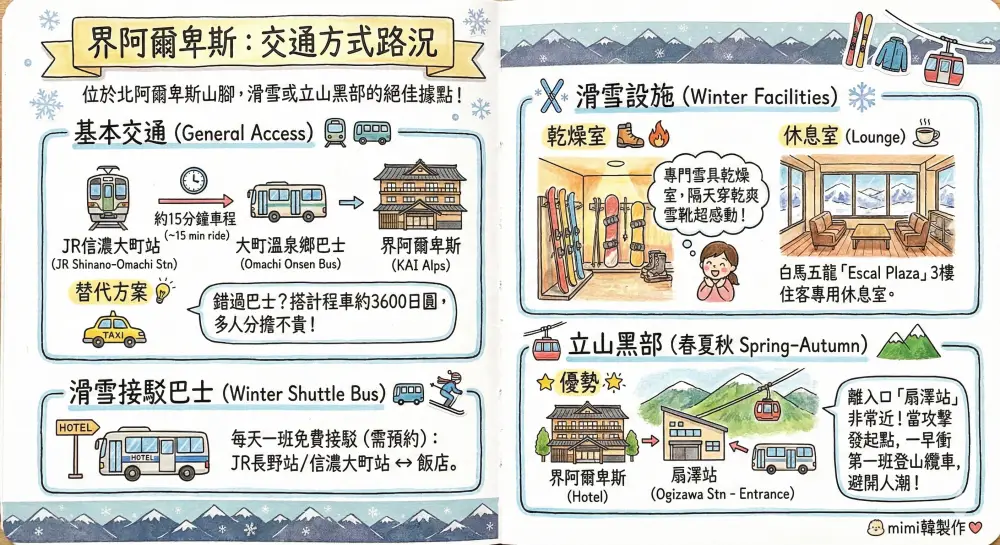 - 接駁巴士:每天有一班接駁巴士(免費,但需預約)從 JR 長野站/JR 信濃大町站開往飯店。