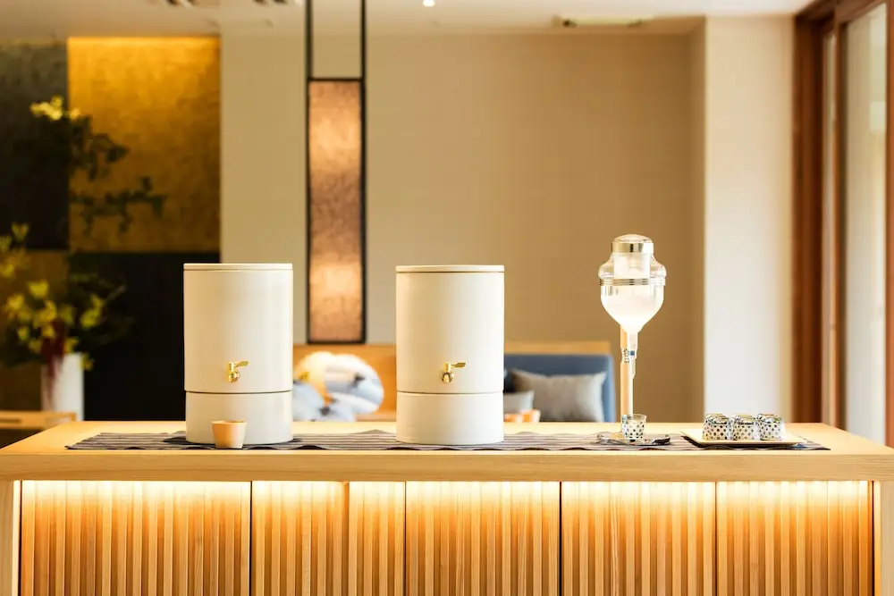 最讓我喜歡的是窗邊的「品茶專區」。 不同於一般飯店只給兩個茶包打發你,這裡擺放了整套專業的茶具:急須(茶壺)、湯冷(降溫用)、不同大小的茶杯,以及飯店精選的三種靜岡茶葉。你可以坐在面對湖景的低矮沙發上,照著說明書一步步泡茶。午後陽光灑進來,看著湖面波光粼粼,手裡拿著剛泡好的深蒸茶,這真的是身為「茶控」的高光時刻。