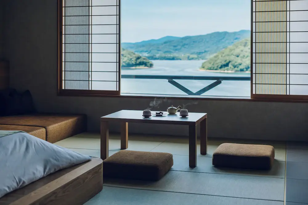 而界遠州更是把「茶」玩到了極致。從大廳飄來的烘焙茶香,到房間裡精緻的茶具組,甚至連溫泉裡都漂浮著裝滿茶葉的竹籃。這裡沒有一般溫泉飯店的硫磺味,取而代之的是一股清新的茶多酚香氣。所有客房都面對著廣闊的濱名湖,視野開闊度極佳。當然,晚餐那道用傳統技法燒烤的「鰻魚全餐」,更是讓無數饕客專程跑一趟的理由。在這裡,你喝的是茶,泡的是茶,吃的還是茶(甜點),這是一場徹頭徹尾的綠色療癒。
