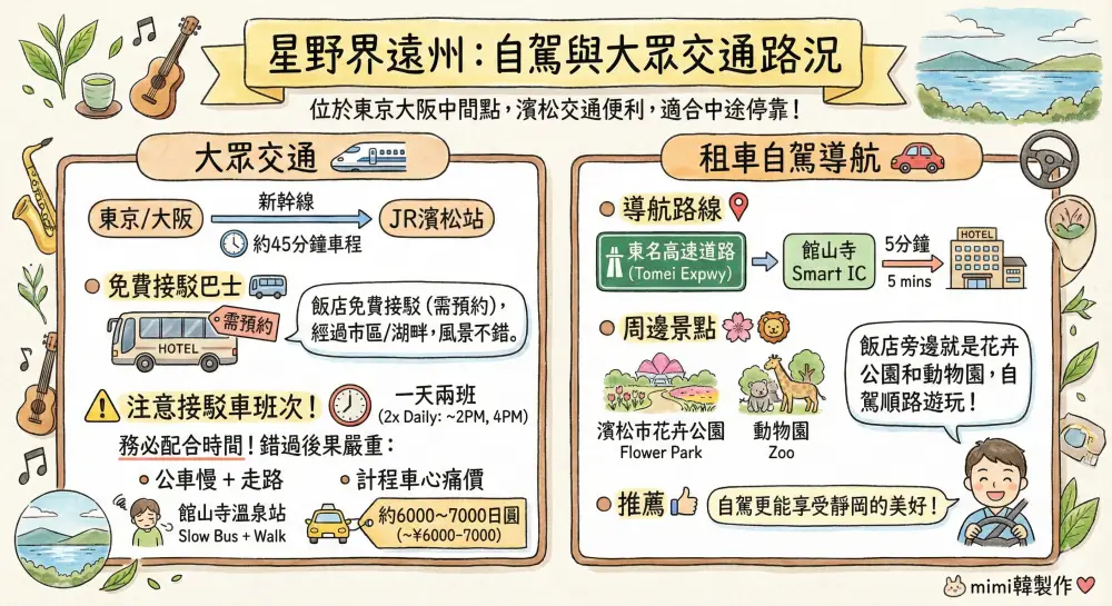 從東名高速道路「館山寺 Smart IC」下來只要5分鐘,直接google導航即可順利抵達,車用GPS可以輸入電話(+815031348092)。另外飯店旁邊就是濱松市花卉公園和動物園,自駕的話可以順路把這兩個點排進去。如果對於日本自駕沒困擾的話,自己開車過來更能享受靜岡的美好。