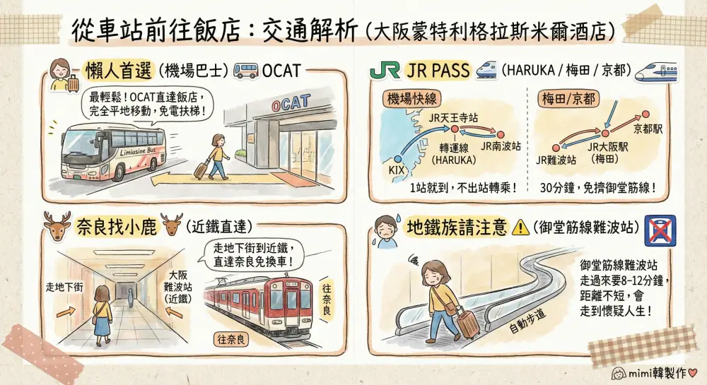 大阪蒙特利格拉斯米爾酒店(Hotel Monterey Grasmere Osaka)它其實是一個三鐵共構的大阪交通樞紐,包含機場利木津巴士、JR、近鐵、地鐵四橋線在此交會,除了離心齋橋鬧區略遠之外,其實整體便利度相當高,底下可以根據你的需求選擇最強路徑: