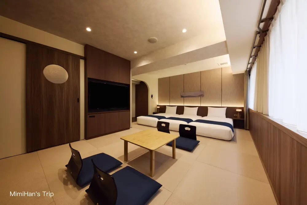 Hotel Village Kyoto在 2025 年剛完成大規模翻新,主打的就是京都市區少見的「大空間」與「多人房」。雖然它不在最熱鬧的河原町正中心,但其實四條大宮站旁邊,交通也意外地順手,這裡沒有那種令人拘謹的高級感,反而是那種可以穿著睡衣在榻榻米上打滾的放鬆氛圍。