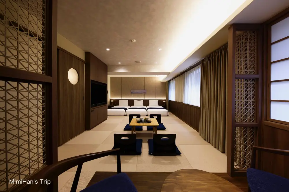 更重視寬敞空間的旗艦房型(約 43㎡ / 最大 6 人),這據說也是飯店最搶手的房型,以櫻花粉色為主調。超寬敞空間在京都真的是豪宅等級,榻榻米區大到晚上大家可以圍成一圈吃宵夜、玩牌,很有「畢業旅行」的感覺。