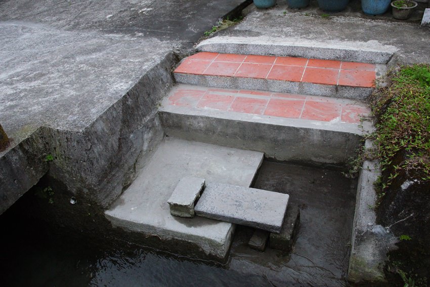 水圳沿途可見洗衣池,從前染布後,居民常常會多走幾步路,在這裡洗布,水不深、水流速度卻挺快,常常為聽到一聲高呼後追著水圳奔跑,原來是一個不小心布被沖走了啦!