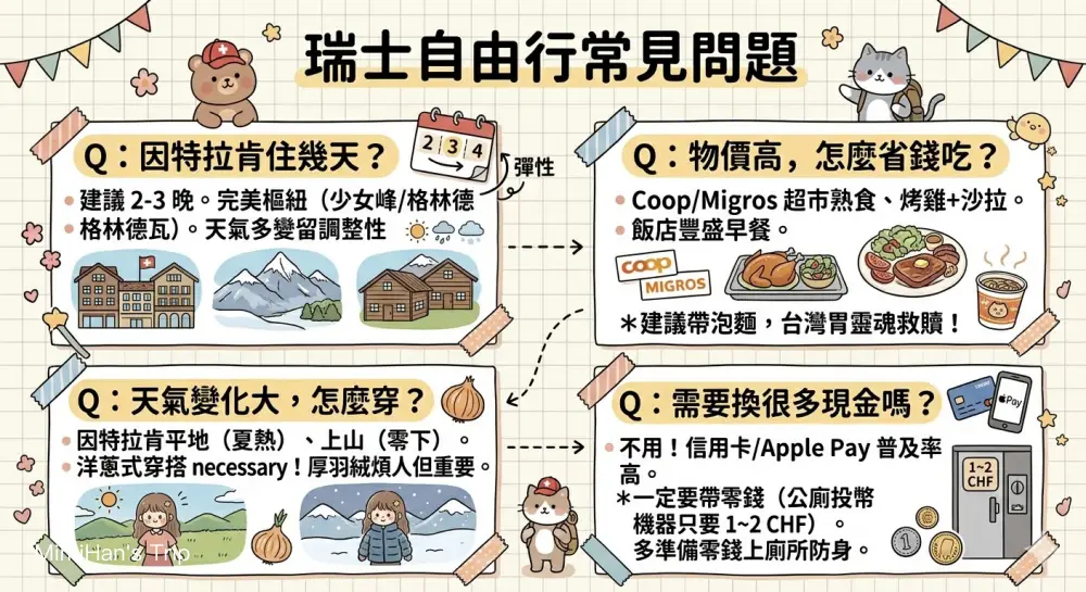 因特拉肯絕對不只是一個用來睡覺的轉運站,它的湖光山色與悠閒步調,值得大家放慢腳步好好品味。雖然瑞士的物價常常讓人結帳時心驚肉跳,但只要善用超市資源、精準取捨需要花錢的住宿與體驗,依然能玩得優雅又充實。這趟阿爾卑斯山下的純粹感動,絕對會成為妳記憶中最美的一頁。