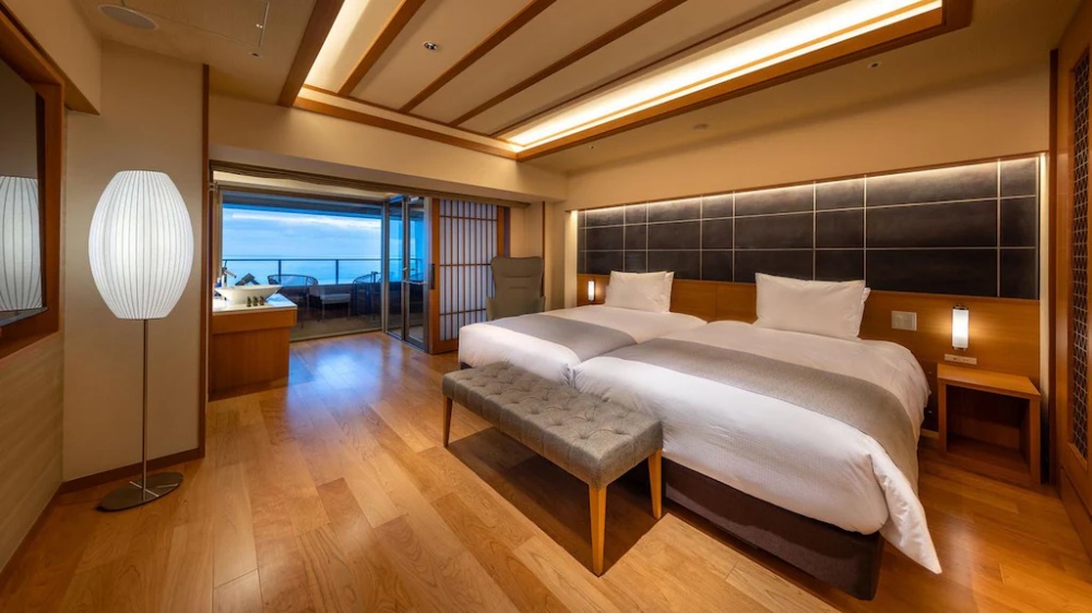✅ 奢華現代感十足的海濱度假飯店,坐落於熱海港旁的黃金地段,從大廳、客房到頂樓露天風呂皆可欣賞一望無際的相模灣海景。