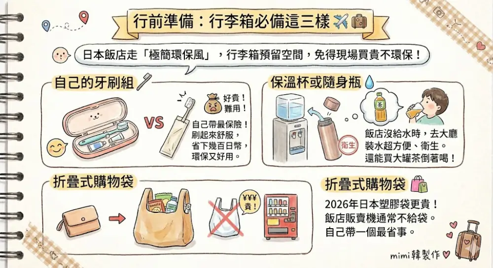 【2026日本住宿】飯店沒牙刷?水要自己裝?5大環保新制與過來人教你怎麼帶行李