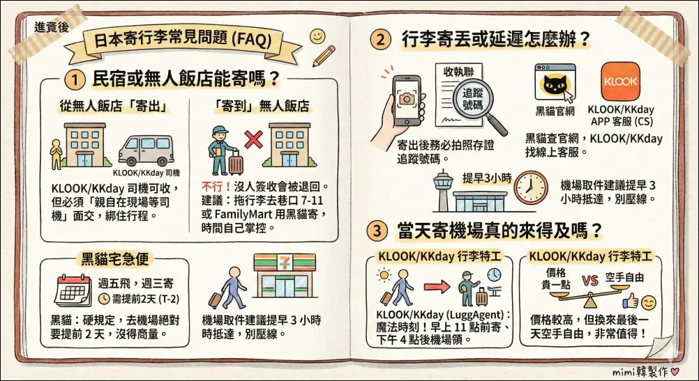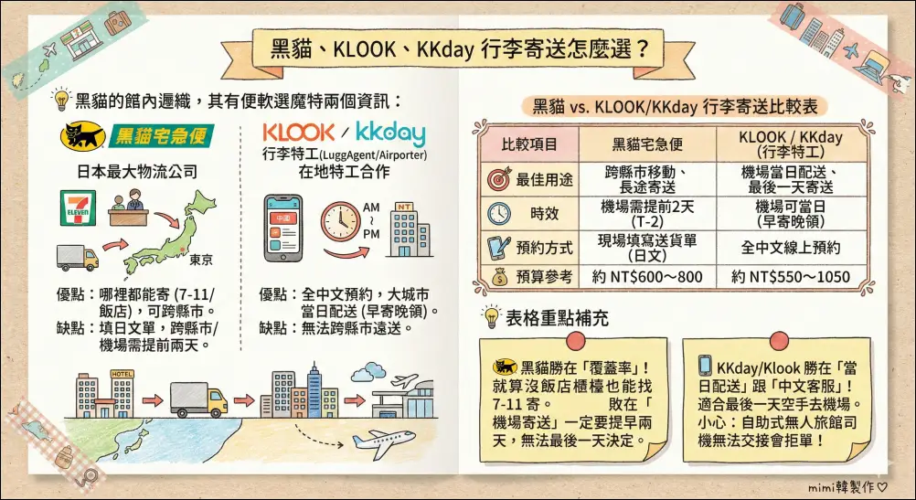 - 黑貓:勝在「覆蓋率」,就算飯店沒櫃檯也能去找 7-11 寄,但缺點是規劃「機場寄送」一定要提早1~2天,沒辦法最後一天才決定。