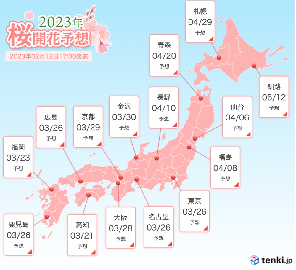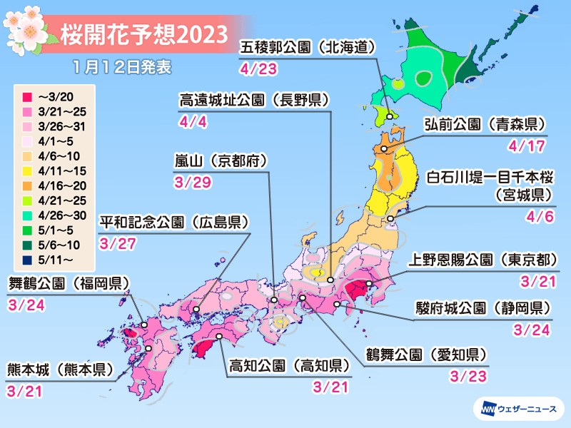 Weathernews 公布2023年第一波日本櫻花開花預測,抓的日期和往年平均差不多,部分略早。上面顯示的是”開花日”,到”滿開”還需要7天左右唷!