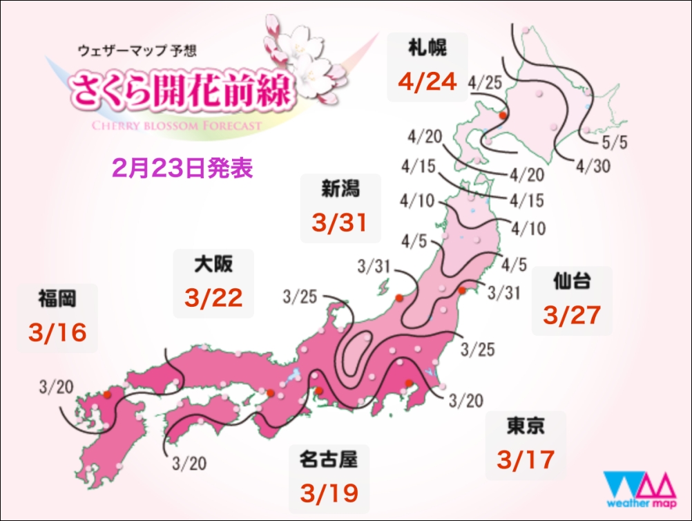 Weathermap網站有註明,2023前五波日本櫻花預測公佈時間:1/26、2/2、2/9、2/16、2/23。接著3/2之後每週一、四密集更新。