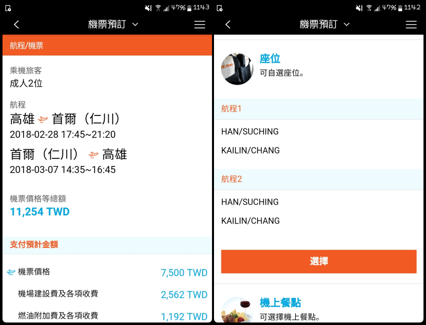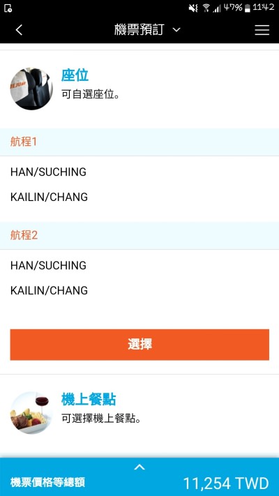 最後就是看要不要加價選座位,或是加購機上餐點,最後總價會計算在側欄中。兩個人高雄 – 首爾機票 11.254 元。