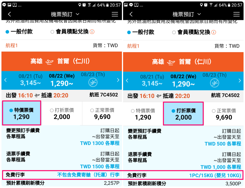 例如我們預計八、九月要飛韓國,高雄 – 首爾就找到單程$1,290元的特價機票、$2,000元的打折機票,這時候選哪種比較好呢?便宜就好嗎?不一定唷!