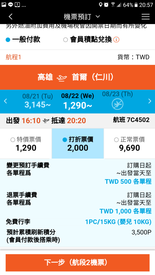 需要注意的是”特價機票”是不包含免費托運行李的,而濟州航空加購15Kg行李的費用是1,170元,以上面的機票價格來說,除非妳只需要手提登機,沒有大行李托運,否則選2,000元的打折機票比較划算(1290+1170>2000)。