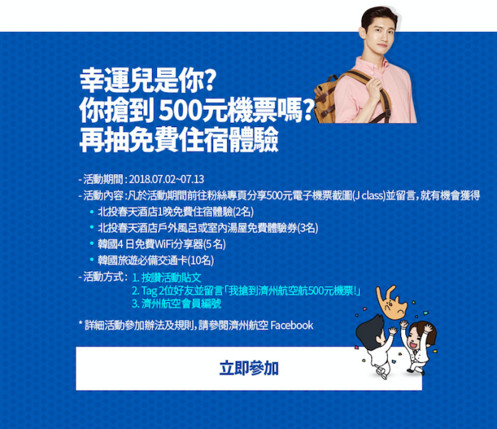 到濟州航空粉絲專頁,上傳妳搶到的500元電子機票截圖&留言&Tag好朋友,還能抽大獎喲!