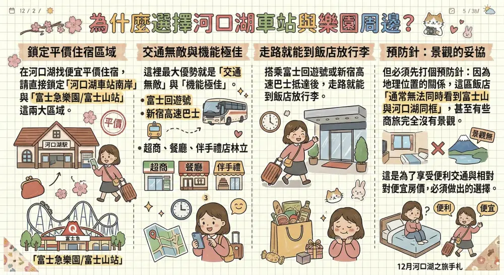 在河口湖找便宜平價住宿,請直接鎖定「河口湖車站南岸」與「富士急樂園/富士山站」這兩大區域。 這裡最大優勢就是「交通無敵」與「機能極佳」。周圍超商、餐廳、伴手禮店林立,搭乘富士回遊號或新宿高速巴士抵達後,走路就能到飯店放行李。