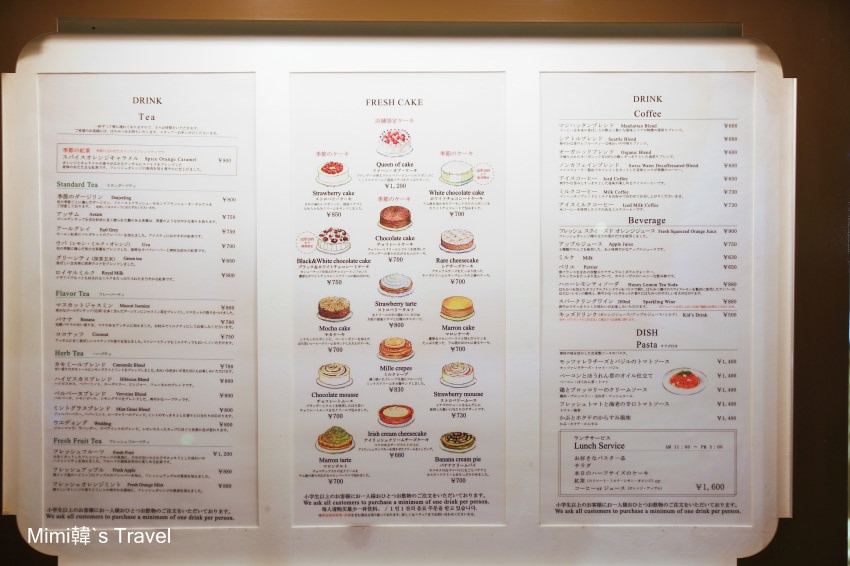 單價¥680~¥1,200,以台灣人的感覺來說並不便宜,但她卻是日本粉領族挺愛來享用的地方,記得之前住在東京的表姊說:我很多朋友一個星期會去吃兩三次,不貴啦 😆 (其實現在台灣的蛋糕也越來越貴,像Mimi家附近的深藍旗艦店,單一塊千層也賣到$240元左右,回不去惹)