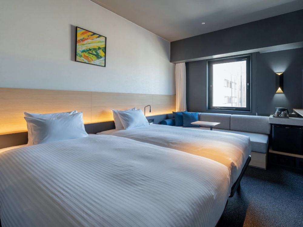 這間飯店雖然稍微有點年紀,但維護得非常好,且位置就在最核心的「辛島町」附近。它最著名的特色就是擁有超可愛的「酷MA萌(熊本熊)主題房」,房間內從抱枕、杯子到壁紙,滿滿的都是熊本部長,對於粉絲來說簡直是天堂。即使是一般房型,空間也比許多新開的商務旅館來得寬敞一些。