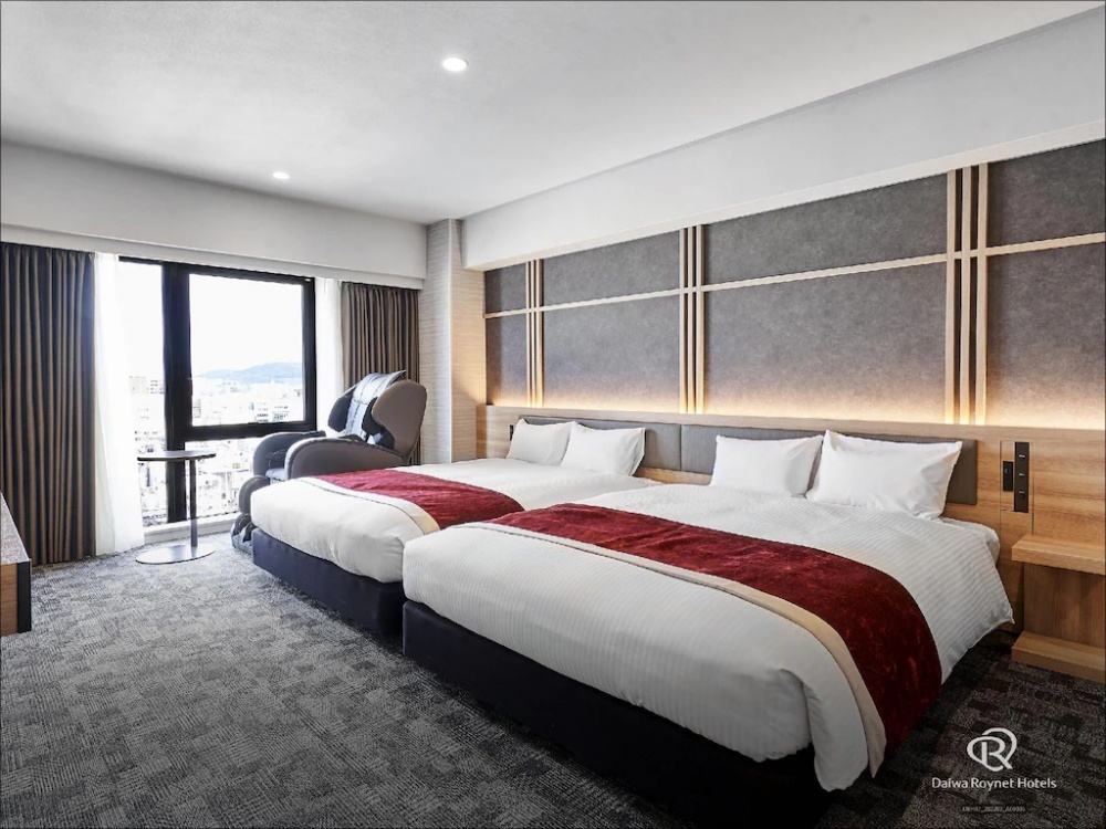 Daiwa Roynet Hotel Kumamoto Ginzadori PREMIER房間坪數也相對寬敞,設有寬大的辦公桌和按摩椅房型。雖然樓下就是鬧區,但高樓層的隔音做得不錯。對於商務出差或是想要住得比普通商旅更寬敞一點的旅人來說,這裡提供了非常棒的居住品質。