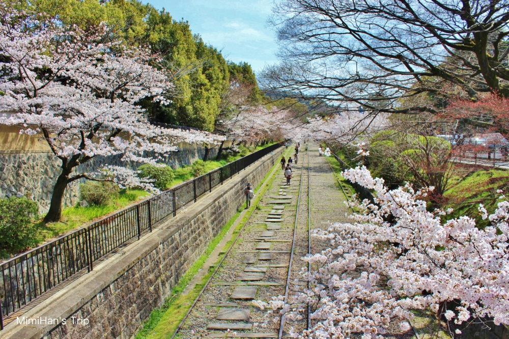 這裡最大的魅力在於「反差感」。這條鐵路原本是明治時期為運輸物資而建的「京都市電蹴上線」,隨著地鐵通車在1965年廢除,留下這段約582公尺的舊鐵道,兩側種滿了染井吉野櫻。當櫻花盛開時,廢棄的灰色鐵軌與粉嫩的櫻花形成強烈對比,被稱為「京都最美廢線」,站在鐵軌中心,被兩側滿開的櫻花包圍,那種震撼力是其他寺廟景點給不了的。