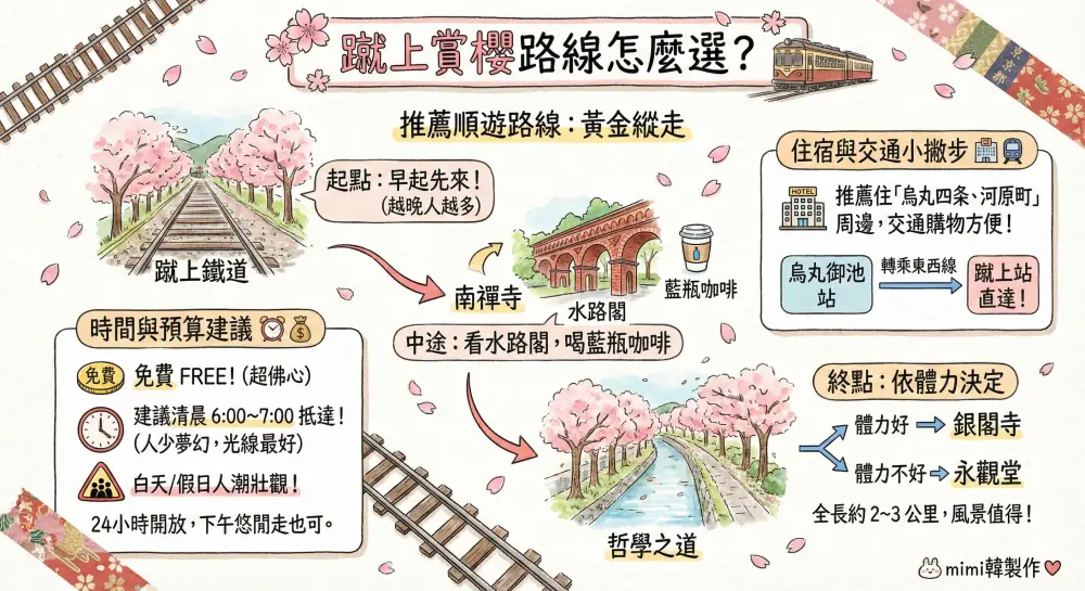 愛的是那整條粉紅色的櫻花隧道配上廢棄鐵軌,畫面美到像電影海報;恨的是這裡的石頭路真的超難走,而且人潮多到讓你懷疑全地球的人都在這。這篇攻略不只要教你怎麼拍出奇蹟美照,更要誠實告訴你這裡的「生存法則」:幾點去才不用P圖?穿什麼鞋子才不會廢腿?以及如何串連周邊的南禪寺與藍瓶咖啡,完成一趟完美的京都賞櫻散步。