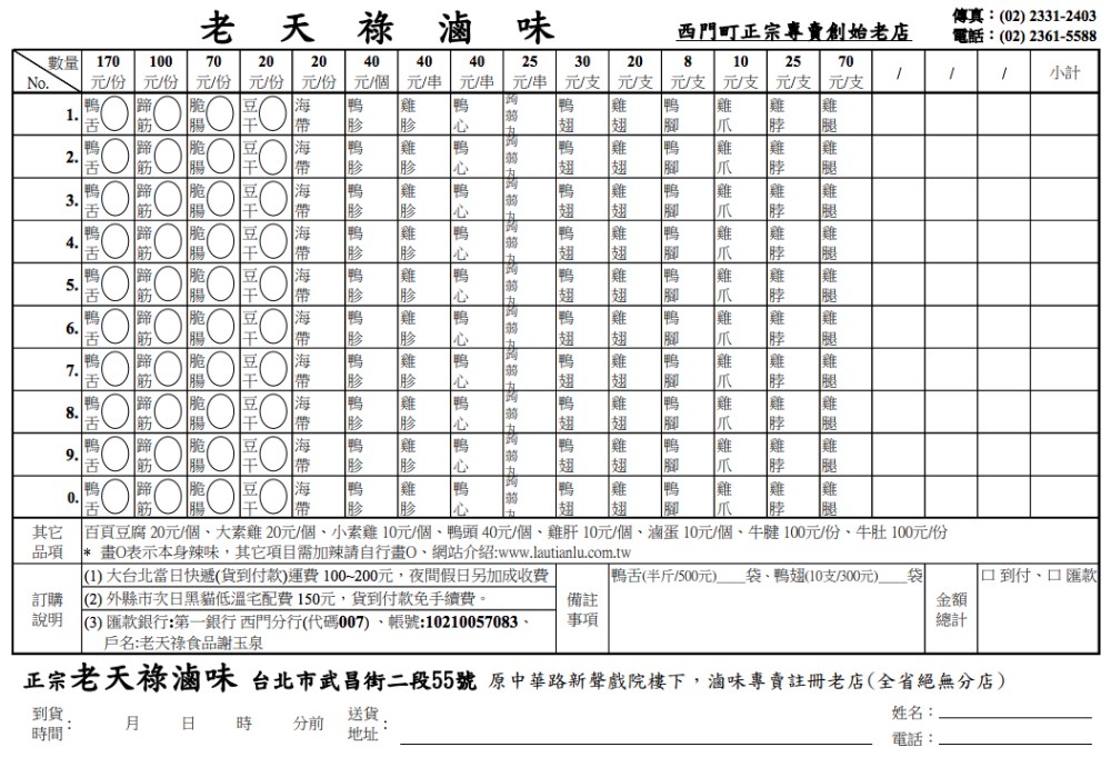 順道附上武昌街老天祿滷味菜單,上面都有種類和價格,也可以填寫之後傳真訂購,運費100~200元,大台北地區當天就可以到貨超方便,不管是要配電視或聚餐小酌都很適合,當成寄送給親朋好友的伴手禮也是很有辨識度。