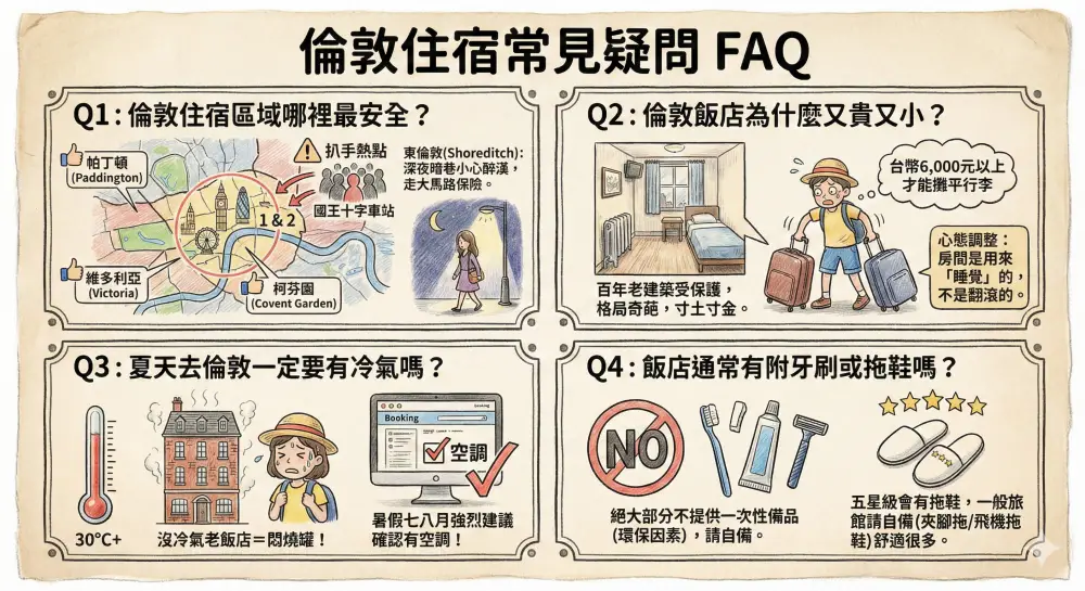 這是一個賭注。以前倫敦夏天不熱,很多百年老飯店(甚至高價位的)根本「沒有裝冷氣」。但這幾年全球暖化,倫敦偶爾會出現30度以上的熱浪,那種時候住在沒冷氣的老磚房裡真的會像「悶燒罐」一樣崩潰。如果你是暑假七八月去,我強烈建議確認訂房網上的設施欄位有勾選「空調」,不然那幾天真的會睡到懷疑人生。