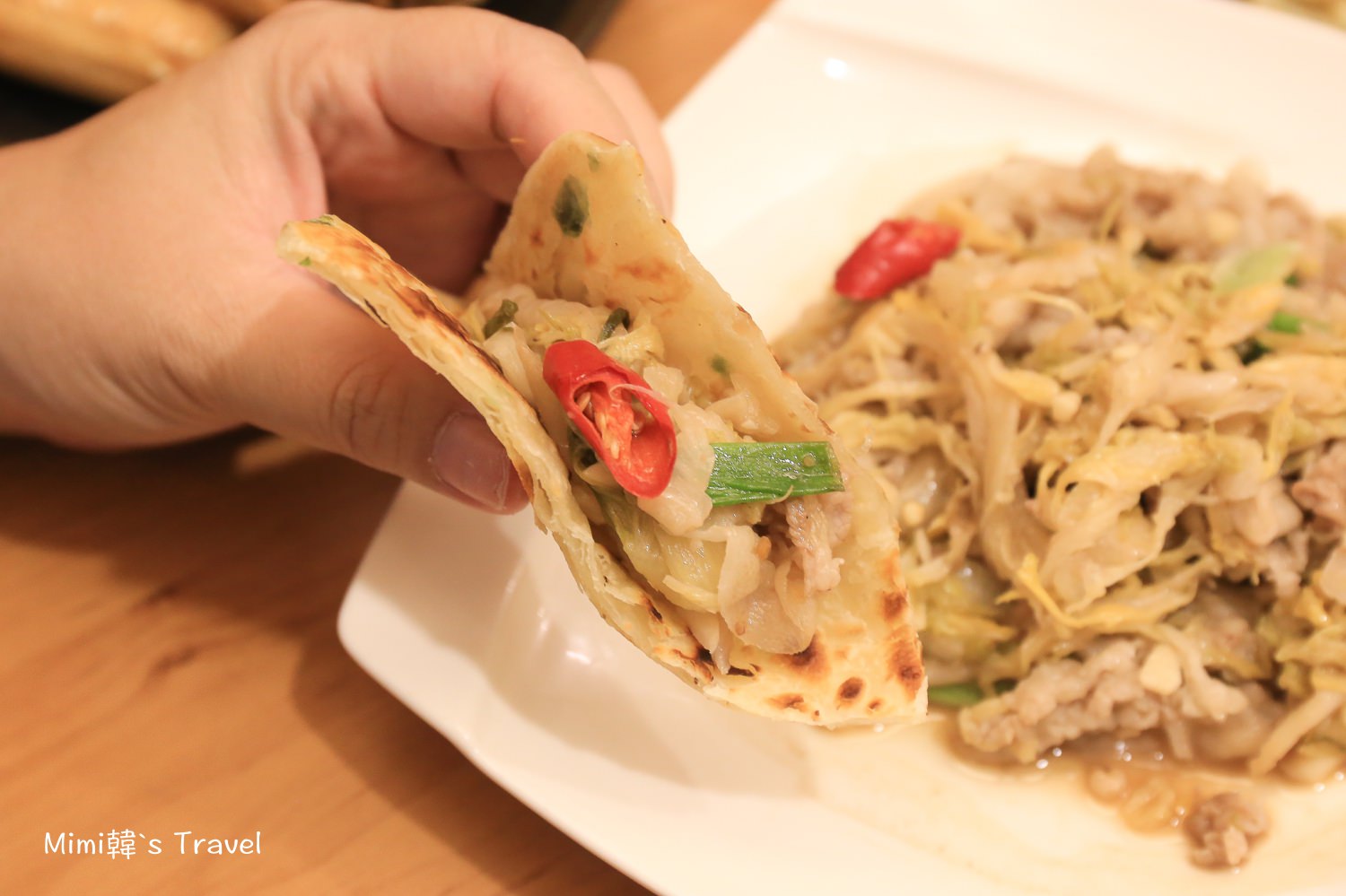 酸白菜炒肉片+蔥油餅皮:現烤的餅皮夾著酸白菜炒肉片,香酸同時在口中融合,吃起來清爽過癮。如果點這個就不需要再吃白飯了 😆