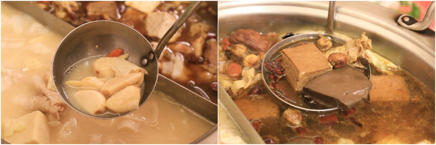 天山百草鍋:就是麻辣鍋,使用花椒、辣椒以及超過十多種的藥材為基底,辣度都可以調整,口味溫和不會死辣,裡面還有鴨血和豆腐,就算喝湯也不會有燥熱的感覺。
