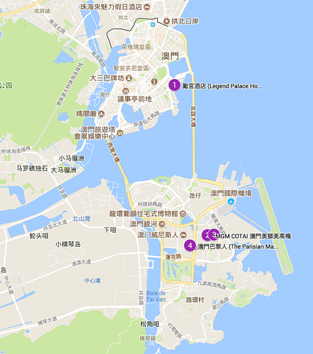 澳門住宿酒店主要分成北邊的澳門半島跟南邊的路氹區,住北邊離機場較遠,但去澳門老城區方便;住南邊離機場近,也是目前較多新五星飯店最集中的地區,有免費接駁去北邊。裏頭標的是寫文章時查詢的最低房價,可能會有變動,還是請順手點進去查詢會更準確唷~