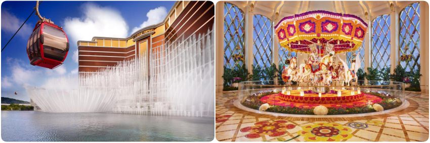 ▲永利皇宮以花為佈置的主題,整體設施高雅又華麗,在永利皇宮的入口處有著佔地8公畝的表演湖、高達25層的音樂噴泉、幻彩金龍,環湖觀光玻璃纜車將帶你進入永利皇宮夢境中的超奢華世界。如有住宿可免費搭乘纜車,居高臨下欣賞每隔20分鐘的水舞表演,晚上加上燈光,更是宏觀及震撼!