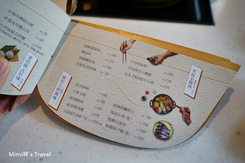 翻開菜單,第一頁就詳細列著毛房使用的多種食材,老闆將日本蔥柚鍋結合在台灣各地的優質物產,其中有小農有機食材、雲林究好豬、台南野飼崎雞的黑羽土雞、當日採買的海鮮、手工火鍋料等,而牛肉則是選用美國進口Prime等級牛小排,這天我們吃到的螃蟹還真的是一點腥味都沒有,新鮮度實在沒話說。