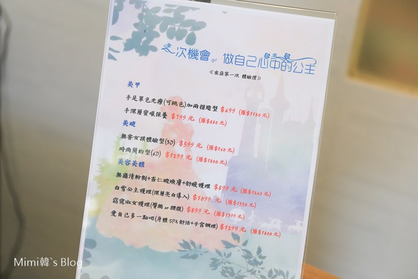 最近因為剛開幕,全部都有體驗價優惠,像原價$1,180元的手足單色光療,現在只要$699元;原價$1,800的6D時尚簡約美睫造型也只需要$1,299元,真的是划算很多,如果還沒讓FiFi服務過的話,推薦趁現在來試試她的手藝。