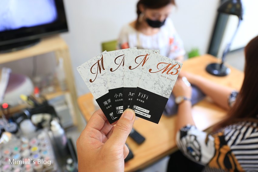 Mimi在選台南美甲店,會習慣跟著和自己Key合、風格也喜歡的指甲彩繪師,最近Mimi的好朋友設計師FiFi和朋友獨立出來經營,在台南東區開了這間「Miss Bello 貝蘿小姐」,提供了美甲、美睫、美容SPA、無痛除毛等服務。