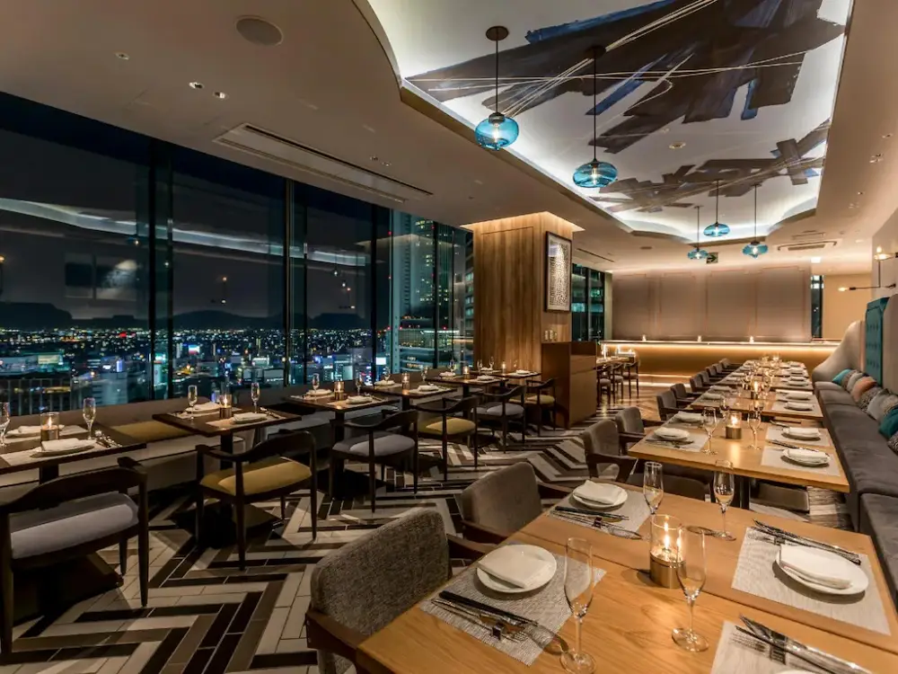 飯店大廳位於 18 樓。電梯門一開,你絕對會發出「哇」的一聲。挑高的大廳配上整面的落地窗,名古屋的城市天際線直接映入眼簾。這裡的設計走的是「大人系的奢華」,燈光偏暗,運用了大量的藝術裝置和金色線條,氣氛非常好。