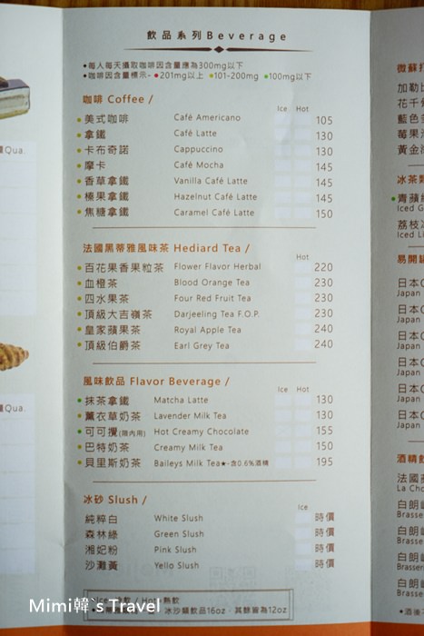 除了櫃台可以直接點選的蛋糕、鹹派和麵包,店裡還提供不少輕食、沙拉、三明治等餐點,還有選擇很多的各種咖啡、花茶、冰沙等飲料。