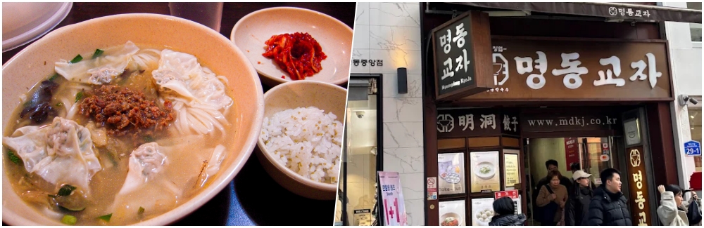 說到明洞必吃,明洞餃子絕對是無可撼動的冠軍王者,這家店已經連續多年獲得米其林必比登推薦。菜單非常簡單,只有刀削麵、蒸餃、辣拌麵跟豆漿麵(夏季限定)。他們的刀削麵湯頭濃郁,充滿肉燥與洋蔥的香氣;蒸餃皮薄餡多,咬下去會爆汁。