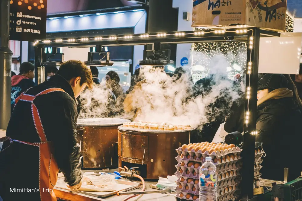 大約下午四點過後,明洞主街的攤販就會陸續出攤。有雞蛋糕、魚板湯、烤肉串、龍蝦燒、糖葫蘆等各種韓國街頭小吃,氣氛非常熱鬧,拍照打卡也很有感覺。但攤販多半只收現金,不接受刷卡或 T-money,請務必準備好小額鈔票。然後買之前一定要先看清楚攤位上的標價,有些海鮮類的烤物價格會讓人嚇一跳。